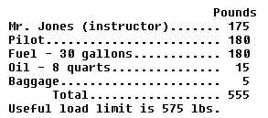 Now suppose that Mr. Jones, in the example, is replaced by a new instructor who weighs 210 lb. A useful load check will show that the aircraft is too heavy. The pilot in our example must reduce the load to the specified useful load limit. There is no alternative in this small aircraft but to reduce the fuel load, even if all the baggage has been removed.
