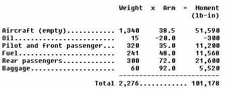 6. Adding the weights produces a total of 2,276 lb., and adding the moments produces a total of 101,178 lb-in. The c.g. is calculated by dividing the total moment by the total weight: