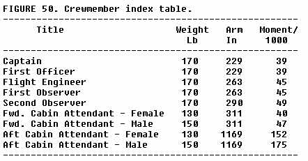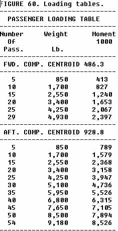A typical passenger load index chart is shown in figure 60. It should be noted that this chart assumes that passengers are seated in the normal distribution around the center (centroid) of the forward and aft passenger compartments. A separate table in figure 60 provides information about cargo loads. The assumption is again made that the cargo is loaded evenly around the centroid of the cargo hold.