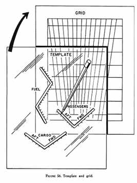 TEMPLATE AND GRID. A similar system makes use of a large weight and balance grid upon which the weight items are directly plotted. The grid indicates the weight and balance limits of the aircraft as expressed in % MAC. The grid can be printed on a hard plastic material from which the plot is erased after use or on a paper form which is kept as a record for each flight. The values for the load items are plotted progressively by the use of a plastic template (fig. 56). The final plot of the fuel load terminates at the intersection of the total weight and c.g. in % MAC.