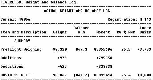 When equipment changes take place, an appropriate entry is made on a weight and balance log or the equipment list itself is amended so that the empty weight and c.g. are properly corrected. It is essential that any change in structure or equipment be entered in the records, otherwise all other calculations will be inaccurate. Part of a weight and balance log for an FAA aircraft is shown in figure 59.