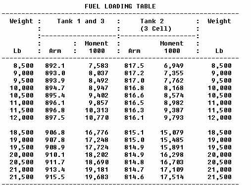 from standard tables or by calculating the moment of the fuel in each tank.