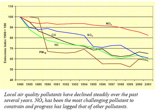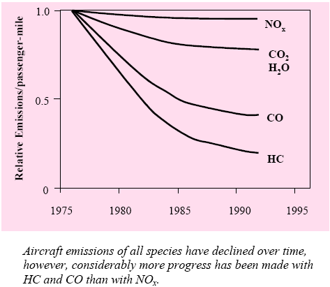 Compared to other sources, aviation emissions are a relatively small contributor to air quality concerns both with regard to local air quality and greenhouse gas emissions. While small, however, aviation emissions cannot be ignored. In the past three decades, aggregate emissions of the air pollutants EPA regulates (nitrogen dioxide, ozone, sulfur dioxide, particulate matter, carbon monoxide, and lead) have declined by 25 percent nationally, according to their report National Air Quality 2001 Status and Trends10. As can be seen in the following chart, greater progress has been made with some individual pollutants than with others. Aircraft emissions have also declined over time when you consider the emissions from transporting one passenger one mile. The following chart shows that relative aircraft emissions have fallen consistently over time. |