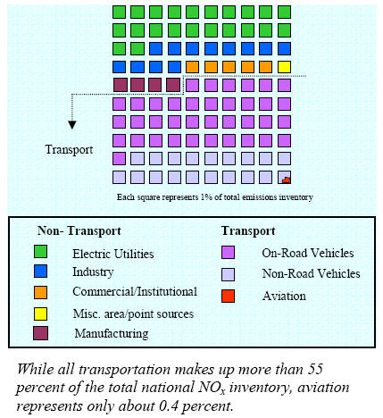 Total aircraft emissions have increased, however, since aviation has grown considerably over the same period. As with emissions nationally, a great deal of progress has been made reducing emissions of HC and CO. NOx, a key constituent of ozone, has proven to be the most difficult pollutant to control both nationally and for aviation. NOx comes from a wide variety of sources in all sectors of the economy. Since essentially all NOx comes from combustion processes, electric utilities, industry, and transportation are significant emitters and make up the largest share of the total inventory. Currently aviation contributes 0.4 percent of the inventory as can be seen in the illustration. Aviation’s contribution to the national NOx emissions inventory has recently declined further as air travel growth has been interrupted during the past two to three years due to the terrorist acts of 9/11, the war on terrorism in Iraq, the emergence of severe acute respiratory syndrome (SARS), and a generally difficult economic environment. These conditions have caused a more than ten- percent decline in air traffic and a similar drop in emissions. |