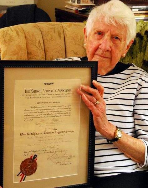 Edna Paul holds a certificate naming her a record-holder pilot from the The National Aeronautic Association
