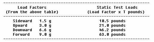 (3) Determine what additional load factors are applicable to the specific seat, litter, berth, or cargo tiedown device installation. The ultimate load factors are then multiplied by these factors to obtain the static test factors. (To simplify this example, only the seat, litter, berth, and safety belt attachment factor of 1.33 was assumed to be applicable. See Item E, column 4, of figure 1.1.)