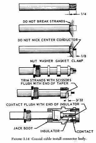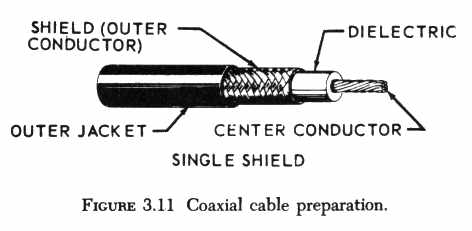 (2) Comb out the braid and bend back to expose the dielectric. Use a sharp knife to cut the dielectric around the circumference, not quite through to the center conductor. Do not nick or cut the conductor. Remove the dielectric by twisting and pulling. {See Figure 3.11.}