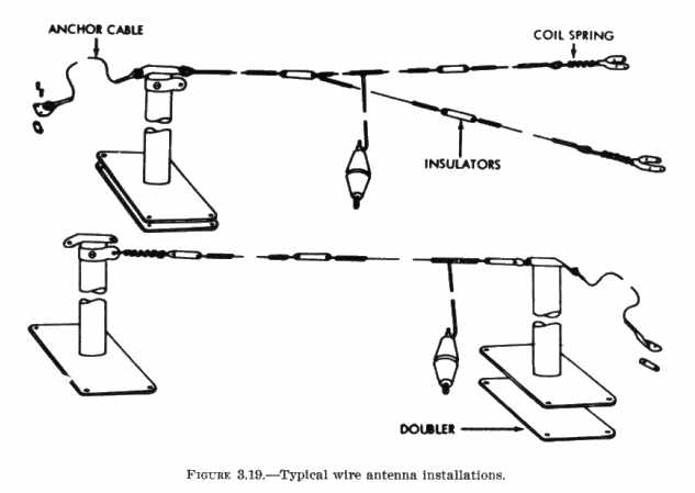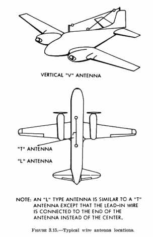 Mount "T", "L", or "V" antennas on top or bottom of the aircraft with approximately 1 foot clearance from the fuselage and wings. Typical wire antenna installations are shown in figures 3.15 through 3.19. {See Figure 3.16} {See Figure 3.17} {See Figure 3.18}