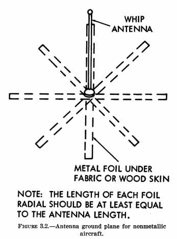 c. On fabric covered aircraft or aircraft with other types of nonmetallic skin, the manufacturer's recommendations should be followed in order to provide the necessary ground plane. An acceptable method of accomplishing this is by providing a number of metal foil strips in a radial position from the antenna base and secured under the fabric or wood skin of the aircraft. (See figure 3.2)