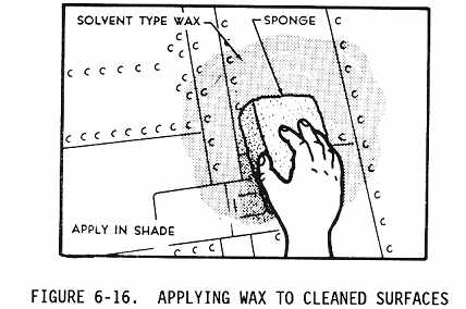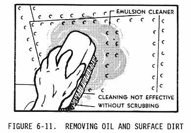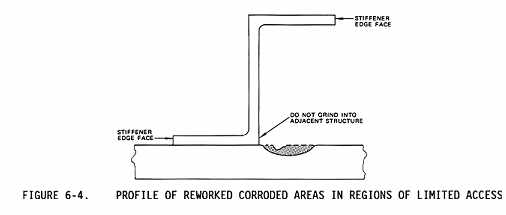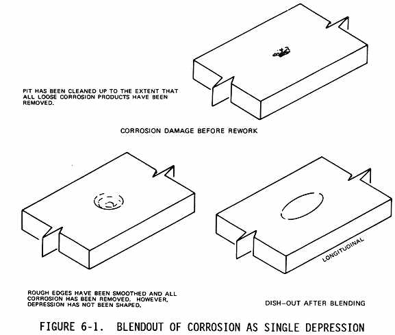d. Protect the pitot static ports, louvers, airscoops, engine opening, wheels, tires, magnesium skin panels, and airplane interior from moisture and chemical brightening agents. e. Protect the surfaces adjacent to rework areas from chemical paint strippers, corrosion removal agents, and surface treatment materials. 613. PAINT REMOVAL. a. For small areas of metallic surfaces, paint may be removed by hand, using a medium grade abrasive mat. For larger areas, chemical paint removal is the preferred method. b. Phenolic and nonphenolic chemical paint removers containing methylene chloride are recommended for paint striping on metallic surfaces only. Chemical paint strippers containing acid should not be used as hydrogen embrittlement on high strength steel and some stainless steels will occur. The following procedure is recommended when using chemical paint remover: (1) Mask acrylic windows and canopies, other plastic parts, rubber hoses, exposed wiring, composite surfaces, wheels and tires, and any other areas where the paint remover residue cannot be removed and refinishing cannot be accomplished; (2) Remove sealants when required, by cutting away excess sealant with a sharp plastic scraper; (3) Apply a thick, continuous coating of paint remover to cover the surface to be stripped; (4) Allow paint remover to remain on the surface for a sufficient length of time to wrinkle and completely lift the paint. Reapply paint remover as necessary in the areas where paint remains tight or where the material has dried. Micarta scrapers, abrasive pads, or fiber brushes may be used to assist in removing persistent paint; (5) Remove loosened paint and residual paint remover by washing and scrubbing the surface with fresh water and a stiff nylon bristle brush or an abrasive pad; and (6) After thorough rinsing, remove masking materials and thoroughly clean the area with a solution of aircraft cleaning compound to remove paint remover residues. c. For composite surfaces, paint removal should be done by mechanical removal techniques (scuff sanding) only. Composite surfaces include fiberglass, kevlar, carbon, graphite, and others. Due to the irregularities in composite surfaces (fiber weave), complete removal of the paint system can not be accomplished without surface fiber damage. d. Mechanical paint removal may be done by hand or with fine or very fine abrasive mats or flap brushes on power tools. If power tools are used, care must be used to prevent removal of the base material. 614. SPECIAL TECHNIQUES. In special instances, a particular or specific method may be required to remove corrosion. Depending upon rework criteria, corrosion in a hole may be removed by enlarging the hole. Abrasive blasting may be required for removing corrosion from steel fasteners, side skins, or irregularly shaped parts or surfaces. Whenever such special cases occur, the specified method for corrosion removal should be observed. 615. FAIRING OR BLENDING REWORKED AREAS. All depressions resulting from corrosion rework should be faired or blended with the surrounding surface. Fairing can be accomplished as follows: a. Remove rough edges and all corrosion from the damaged area. All dish outs should be elliptically shaped with the major axis running spanwise on wings and horizontal stabilizers, longitudinally on fuselages, and vertically on vertical stabilizers. (SELECT THE PROPER ABRASIVE FOR FAIRING OPERATIONS FROM TABLE 6-1.) TABLE 6-1. ABRASIVES FOR CORROSION REMOVAL
