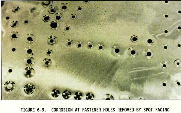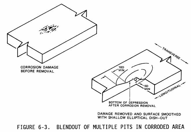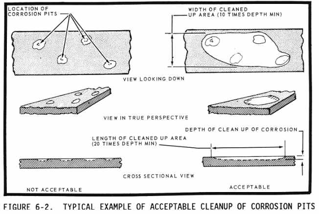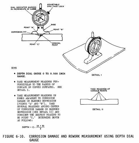 SECTION 4. CORROSION DAMAGE AND REWORK LIMITS 640. DISCUSSION. Corrosion evaluation will be required after general inspection and cleaning to determine the nature and extent of repair or rework. Local blending of corroded areas may be required to determine the total extent of the corrosion problem (see Figures 6-1, 6-2, 6-3 and 6-4). Corrosion damage classifications are defined as follows: a. Light corrosion. Characterized by discoloration or pitting to a depth of approximately 0.001 inch maximum. This type of damage is normally removed by light, hand sanding or a minimum of chemical treatment. b. Moderate corrosion. Appears similar to light corrosion except there may be some blisters or evidence of scaling and flaking. Pitting depths may be as deep as 0.010 inch. This type of damage is normally removed by extensive mechanical sanding. c. Severe corrosion. General appearance may be similar to moderate corrosion with severe blistering exfoliation and scaling or flaking. Pitting depths will be deeper than 0.010 inch. This type of damage is normally removed by extensive mechanical sanding or grinding. Severe corrosion damage beyond the limits of the aircraft structural repair manual will require FAA approved engineering authorization and may include the following typical corrosion repairs: trimming out of cracked and corroded areas (see Figure 6-8) or spot facing of fastener locations (see Figure 6-9). 641. REMOVAL OF CORROSION. There are two basic methods of corrosion removal, mechanical and chemical. The method used depends upon the type of structure, its location, the type and severity of corrosion, and the availability of maintenance equipment. Mechanical methods of corrosion removal are the most commonly used including: sanding, buffing, grinding, and section removal. Avoid the use of soft metal wire brushes (i.e., copper alloys) as residual traces of copper on cleaned metal will contribute to future corrosion. If brushes are used they should be stainless steel or nonmetallic. Mechanical methods of corrosion removal are used on all three levels of corrosion damage. Chemical methods of corrosion removal are limited to light corrosion and only in areas where the chemicals cannot migrate to other areas. 642. DETERMINING DEGREE OF CORROSION DAMAGE. Determine degree of corrosion damage (light, moderate, or severe) with a depth dial gauge, straight edge, or a molding compound. The depth of corrosion cannot be measured until all the corrosion is removed. Before measurements are made, visually determine if corrosion is in an area which has previously been reworked. If corrosion is in the recess of a faired or blended area, measure damage to include the material which has previously been removed. The following method outlines the process for taking measurements with the depth gauge. a. Remove loose corrosion products, if present. b. Position depth gauge as illustrated in Figure 6-10 and determine the measurement reading. NOTE: The base of the depth gauge should be flat against the undamaged surface on each side of the corrosion. When taking measurements on concave or convex surfaces, place the base perpendicular to the radius of the surface as shown in Figure 6-10. c. Take several additional depth readings. d. Select deepest reading as being the depth of the corrosion damage. 643. DETERMINING REWORK LIMITS. The maximum allowable amount of material removed from any damaged surface may be determined from criteria contained in the allowable damage limit chart in the manufacturer's repair manual. If no criteria is given, contact the aircraft manufacturer for cleanup limits. 644. DETERMINING MATERIAL THICKNESS REDUCTION AFTER CORROSION CLEANUP. The amount of material which may be removed from a part or panel during corrosion cleanup is usually available in the manufacturer's allowable damage limit charts. To ensure that the allowable limits are not exceeded, an accurate measurement should be made of the material removed or material thickness remaining in the reworked area. a. Measurement of panel thickness after rework can be made using an ultrasonic tester. This method requires a qualified NDI operator and suitable test standards for calibration. b. Measurement of the depth of blended pits (material removed) can be made using a depth dial gauge (see Figure 6-10). If the depth dial gauge will not work, clay impressions, liquid rubber, or other similar means which will give accurate results may be used to determine material removed. In the event that material removal limits have been exceeded, the area or part should be repaired or replaced. If replacement or repair criteria is not contained in the repair manual, contact the manufacturer or the FAA. 645 - 649 RESERVED.
