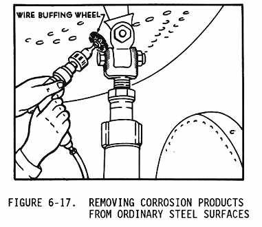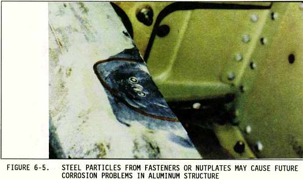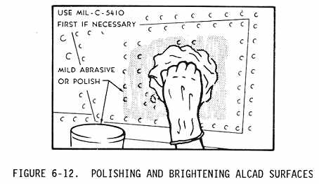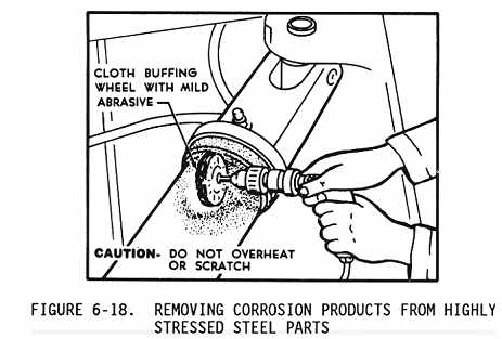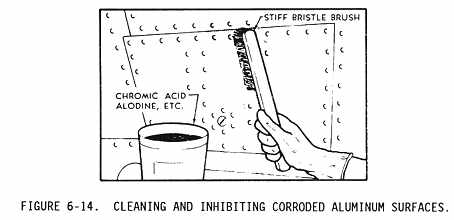 Treat as follows: (i) If splashed into eyes, quickly wipe eyelids with a soft cleaning tissue and immediately flush eye with gentle stream from a drinking fountain, cup, or other convenient water outlet while holding lids open. Call an ambulance and continue the flushing procedure until an ambulance arrives. (ii) If splashed onto an easily accessible part of body, immediately drench affected area with water until ambulance arrives. (iii) If splashed onto clothing or large area of body, immediately drench body and remove clothing while drenching until ambulance arrives. (iv) If taken internally, begin following treatment immediately: (A) If the person is conscious, cause vomiting by placing finger in back of the person's throat. Encourage the person to drink large quantities of water and repeatedly wash out the mouth. (B) If the person is unconscious, do not give any liquid. Start artificial respiration at once. Continue until ambulance arrives. If person regains consciousness before ambulance arrives, proceed as in subparagraph (A). 601. GENERAL CORROSION CONTROL WORK PROCEDURES. The effectiveness of corrosion control depends on how well basic work procedures are followed. The following common work practices are recommended: a. If rework procedures or materials are unknown, contact the aircraft manufacturer or authorized representative before proceeding; b. The work areas, equipment, and components should be clean and free of chips, grit, dirt, and foreign materials. c. Do not mark on any metal surface with a graphite pencil or any type of sharp, pointed instrument. Temporary markings (defined as markings soluble in water or methyl chloroform) should be used for metal layout work or marking on the aircraft to indicate corroded areas. d. Graphite should not be used as a lubricant for any component. Graphite is cathodic to all structural metals and will generate galvanic corrosion in the presence of moisture, especially if the graphite is applied in dry form. e. Footwear and clothing should be inspected for metal chips, slivers, rivet cuttings, dirt, sand, etc., and all such material removed before walking or working on metal surfaces such as wings, stabilizers, fuel tanks, etc. f. Do not abrade or scratch any surface unless it is an authorized procedure. If surfaces are accidentally scratched, the damage should be assessed and action taken to remove the scratch and treat the area. g. Coated metal surfaces should not be polished for aesthetic purposes. Buffing would remove the protective coating and a brightly polished surface is normally not as corrosion resistant as a nonpolished surface unless it is protected by wax, paint, etc. A bare skin sheet polished to a mirror finish is more resistant than a bare mill finished sheet when both are given regular maintenance. h. Protect surrounding areas when welding, grinding, drilling, etc., to prevent contaminating them with residue from these operations. In those areas where protective covering cannot be used, action should be taken to remove the residue by cleaning. i. Severely corroded screws, bolts, and washers should be replaced. When a protective coating, such as a cadmium plating on bolts, screws, etc., is damaged, immediate action should be taken to apply an appropriate protective finish to prevent additional corrosion damage. 602 - 609 RESERVED. SECTION 2. CORROSION REMOVAL TECHNIQUES 610. GENERAL. When active corrosion is visually apparent, a positive inspection and rework program is necessary to prevent any further deterioration of the structure. The following methods of assessing corrosion damage and procedures for rework of corroded areas could be used during cleanup programs. In general, any rework would involve the cleaning and stripping of all finish from the corroded area, the removal of corrosion products, and restoration of surface protective film. a. Repair of corrosion damage includes removal of all corrosion and corrosion products. When the corrosion damage exceeds the damage limits set by the aircraft manufacturer in the structural repair manual, the affected part must be replaced or an FAA approved engineering authorization for continued service for that part must be obtained. b. For corrosion damage on large structural parts which is in excess of that allowed in the structural repair manual and where replacement is not practical, contact the aircraft manufacturer for rework limits and procedures. 611. STANDARD METHODS. Several standard methods are available for corrosion removal. The methods normally used to remove corrosion are mechanical and chemical. Mechanical methods include hand sanding using abrasive mat, abrasive paper, or metal wool, and powered mechanical sanding, grinding, and buffing, using abrasive mat, grinding wheels, sanding discs, and abrasive rubber mats. However, the method used depends upon the metal and the degree of corrosion. The removal method to use on each metal for each particular degree of corrosion is outlined in the following paragraphs. 612. PREPARATIONS FOR REWORK. All corrosion products should be removed completely when corroded structures are reworked as the corroding process will continue even though the affected surface is refinished. Before starting rework of corroded areas, carry out the following: a. Position airplane in wash rack or provide washing apparatus for rapid