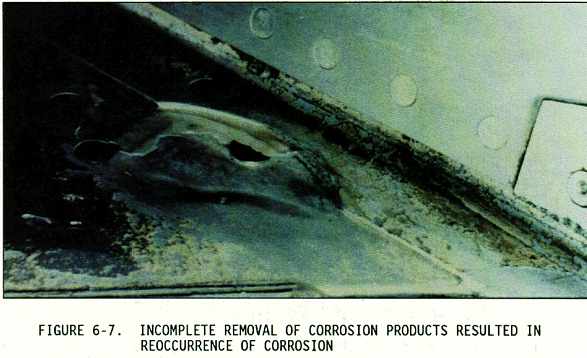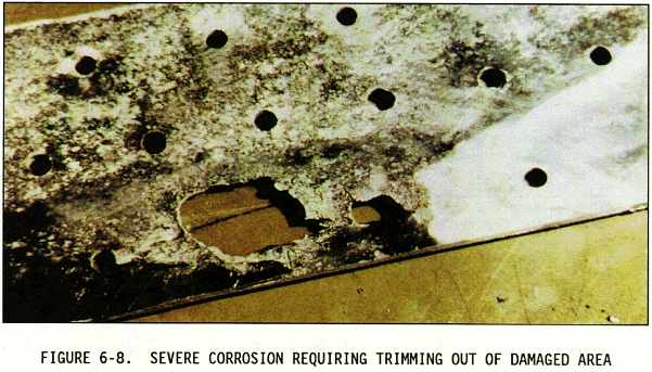 SECTION 5. ALUMINUM AND ALUMINUM ALLOYS 650. TREATMENT. In general, corrosion of aluminum can be more effectively treated in place rather than removing structural parts from the aircraft for corrosion treatment. Treatment includes the mechanical removal of the corrosion products, the inhibition of residual materials by chemical means, and the restoration of permanent surface coating. Details of treatment vary depending on whether the aluminum surfaces are to be left bare in use or are to be protected by paint coatings. 651. PROCESSING OF ALUMINUM SURFACES. a. Bare aluminum surfaces. While few unpainted aircraft are used under marine conditions, some general information is included on the nature of alclad surfaces and their treatment. Relatively speaking, pure aluminum has greater corrosion resistance than the stronger aluminum alloys. Advantage is taken of this by laminating a thin sheet of relatively pure aluminum, one to five mils thick, over the base higher strength aluminum alloy surface. The protection obtained is good, and the alclad surface can be maintained in a polished condition (see Figure 6-12). In cleaning such surfaces, however, care should be taken to prevent staining and marring of the exposed aluminum, and more important from a protection standpoint, to avoid unnecessary mechanical removal of the protective alclad layer and the exposure of more susceptible, but stronger, aluminum alloy base material. b. Additional processing of aluminum surfaces prior to paint finishes. Aluminum surfaces that are to be subsequently painted can be exposed to more severe cleaning procedures and can also be given more thorough corrective treatment prior to painting. Application of a paint finish requires proper prepaint treatment for good paint adhesion. c. Special treatment of anodized surfaces. Anodizing is the most common surface treatment of aluminum alloy surfaces. Tank processing is accomplished during manufacture or rework of a part or component and frequently prior to its fabrication from sheet stock. The aluminum sheet or casting is made as a positive pole in an electrolytic bath in which chromic acid or other oxidizing agents produce a supplemental protective oxide film on the aluminum surface. Aluminum oxide is naturally protective and anodizing merely increases the thickness and density of the natural oxide film. When this coating is damaged in service, it can only be partially restored by chemical surface treatment. Therefore, any processing of anodized surfaces should avoid unnecessary destruction of the oxide film. (1) Steel wool, steel wire brushes, copper alloy brushes, or severe abrasive materials should not be used on any aluminum surface. Aluminum wool, fiber bristle brushes, and mild abrasives are acceptable tools for cleaning anodized surfaces, but care should be exercised in any cleaning process to avoid unnecessary breaking of the protective film, particularly at the edges of the aluminum sheet (see Figures 6-11 and 6-13). (2) Tampico fiber brushes are preferred and are adequate to remove most corrosion. Producing a buffed or wire brush finish by any means should be prohibited. Take every precaution to maintain as much of the protective coating as practicable. Otherwise, treat anodized surfaces in the same manner as other aluminum finishes. Vacuum blasting is an acceptable corrosion removal method to remove surface corrosion. Vacuum blasting should not be used to remove intergranular corrosion. (3) Chemical conversion coating (Specification MIL-C-81706) is a chemical surface treatment used on aluminum alloys to inhibit corrosion and to provide a proper surface for paint finishing. d. Special processing of intergranular corrosion in heat treated aluminum alloy surfaces. Intergranular corrosion is usually more severe in heat treated aluminum alloys and is a corrosive attack along grain boundaries of the alloyed aluminum, where the grain boundaries differ from the metal within the grain. When in contact with an electrolyte, rapid corrosion occurs at the grain boundaries. In its most severe form, actual lifting of metal layers (exfoliation) occurs. The mechanical removal of all corrosion products and visible delaminated metal layers should be accomplished in order to determine the extent of the damage and to evaluate the remaining structural strength of the component. (1) Use metal scrapers, rotary files, or abrasive wheels to assure that all corrosion products are removed and that only structurally sound aluminum remains. NOTE: THE USE OF A ROTARY FILE IS RECOMMENDED ONLY FOR SEVERE INTERGRANULAR OR EXFOLIATION CORROSION REMOVAL. (2) Rotary files should be sharp to insure that they cut the metal without excessive smearing. A dull cutting tool will smear the metal over corrosion cracks or fissure and give the appearance that corrosion has been removed, when, in fact, it may not have been. (3) Carbide tip rotary files or metal scrapers should be utilized since they stay sharp longer. Abrasive blasting should not be used to remove intergranular corrosion. (4) Inspection with a 5 to 10 power magnifying glass or the use of dye penetrant will assist in determining if all unsound metal and corrosion products have been removed. (5) When complete removal of corrosion has been accomplished, blend or fair using a ratio of 20:1 (length to depth) in the area of corrosion removal. Blending, where required, can best be accomplished by using aluminum oxide impregnated, rubber base wheels. (6) Chemical conversion coat the exposed surfaces completely and restore paint coatings in the same manner as on any other aluminum surface (see Figures 6-14, 6-15, and 6-16). (7) Corrosion damage beyond the limits set in the structural repair manual should be repaired per a cognizant engineer or aircraft manufacturer's instructions that are FAA approved. 652. REPAIR OF ALUMINUM ALLOY SHEET METAL. After extensive corrosion removal, the following procedures should be followed: a. If water can be trappe