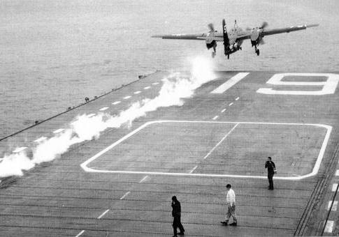 JULY 3--Carrier Aircraft went into action in Korea for the first time. Valley Forge, with Air Group 5, and HMS Triumph operating in the Yellow Sea, launched strikes on airfields, supply lines, and transportation facilities in and around Pyongyang, northwest of Seoul. This was the first combat test for the Grumman F9F Panther and the Douglas AD Skyraider. It was also the occasion for the first Navy kills in aerial combat during the war and the first shoot-down by a Navy jet, as F9F pilots of VF-51, Lieutenant (jg) L. H. Plog and Ensign E. W. Brown shot down two Yak-9's on the first strike over Pyongyang. |