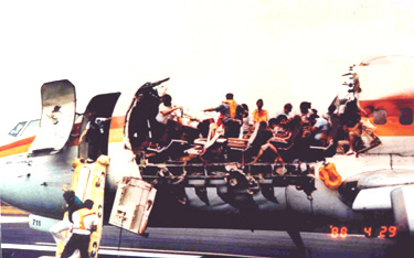 were blown to the floor. One was seriously injured and a seated passenger had to hold on to her to keep her in the aircraft.  The other attendant crawled along the aisle, clinging on to seat legs and comforting passengers.  Not all of the structure had torn away cleanly.  There were jagged bit of metal being battered by the slipstream, then breaking loose and spearing back among the passengers.  Most of the passengers were injured, seven seriously. (Investigation Four Years Later By Martin Aubury).