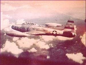 The First Combat Use Of Air-To-Air Refueling Of USAF Fighter May 29,1952 airplanes took place on May 29,1952 when twelve F-84E's of the 159th Fighter-Bomber Squadron flew a bombing mission from Itazuke Air Base in Japan against targets at Sariwon, North Korea. The planes were refueled by KB-29 tankers after they had bombed their targets and were homeward bound. By July 4, 1952, three moreof these "Operation Hightide" missions had been flown. The F-84Es had probes sticking out in front of their tip tanks for use with drogues trailing on hoses from the KB-29s. |