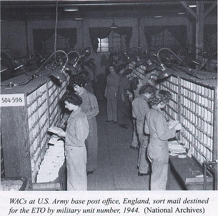 In February 1945 a battalion of black WACs received its long awaited overseas assignment. Organized as the 6888th Central Postal Battalion and commanded by Maj. (later Lt. Col.) Charity Adams, these 800 women were stationed in Birmingham, England, for three months, moved to Rouen, France, and finally settled in Paris. The battalion was responsible for the redirection of mail to all U.S. personnel in the European Theater of Operations (including Army, Navy, Marine Corps, civilians, and Red Cross workers), a total of over seven million people. When mail could not be delivered to the address on the face of the envelope, it was sent to the Postal Directory to be redirected. The 6888th kept an updated information card on each person in the theater. Some personnel at the front moved frequently, often requiring several information updates per month. The WACs worked three eight-hour shifts seven days a week to clear out the tremendous backlog of Christmas mail.