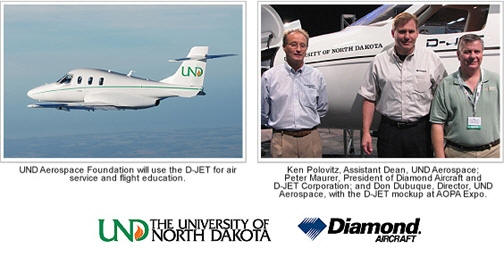 October 05, 2007, At AOPA Expo, UND Aerospace and Diamond Aircraft announced the purchase of a D-JET by UND Aerospace Foundation. The D-JET from Diamond Aircraft will be used for air service and flight education to prepare graduates of the John D. Odegard School of Aerospace Sciences at the University of North Dakota for careers in the emerging VLJ and personal jet market. “Diamond Aircraft and UND have a long-standing relationship, and we are very excited that UND will now be using the D-JET for their advanced training programs,” says Peter Maurer, President of Diamond Aircraft and D-JET Corporation. “We greatly respect the quality of education and training provided by UND, and look forward to exploring the many exciting opportunities this purchase opens up for cooperation between our organizations.” |
