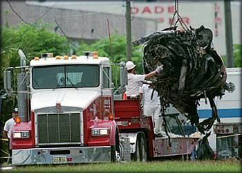 One of the DC-8 engines is loaded onto a flatbed truck.