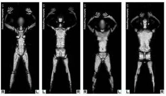 Here’s the lowdown on the two technologies. How millimeter wave works: Beams of radio frequency (RF) energy in the millimeter wave spectrum are projected over the body’s surface at high speed from two antennas simultaneously as they rotate around the body. The RF energy reflected back from the body or other objects on the body is used to construct a three-dimensional image. The three-dimensional image of the body, with facial features blurred for privacy, is displayed on a remote monitor for analysis. The image is not saved – once it’s off the screen it’s gone forever. This is the millimeter wave image a security officer sees.