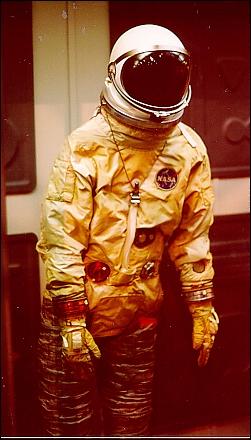 The astronauts elected to remain in their space craft during the recovery and were hoisted aboard the carrier. This space suit was designed to provide thermal protection to astronauts using the Astronaut Maneuvering Unit (AMU).