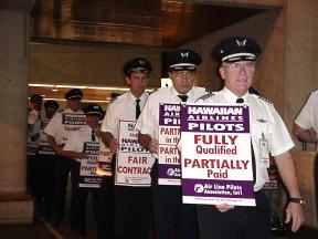 September 1, 2000, Honolulu, HI —Hawaiian Airlines pilots will conduct informational picketing on Monday, September 4, 2000, at five major airports using the observance of Labor Day to spotlight their protest of management’s stalling in contract negotiations. The pilots have been without a new contract since February 2000. The 450 pilots at Hawaii’s oldest and largest carrier, have been in direct negotiations with management since November 1999, and have yet to reach agreement on all major economic items affecting compensation and work rules. Last month, airline management unilaterally filed for mediation, despite the pilots’ strenuous objections. The pilots asserted that bringing a federal mediator to the table at this juncture could delay the scheduling of negotiations. "We are concerned that management’s request for mediation could indicate that it is posturing for more confrontation and less cooperation in the future," said Kirk McBride, chairman of the Hawaiian pilots’ branch of ALPA. |