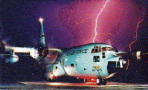 The venerable C-130 Hercules joined weather recce in 1963. At last, using this sturdy, pressurized aircraft, crews could penetrate a hurricane without getting soaked by the heavy rain! The "B" and "E" models of the WC-130 flew many years, and the "H" model continues to fly today. These "Herks" are now over 30 years old, but have proved to be the most dependable of all the aircraft in the pages of weather history. In 1975, a new contender in the exclusive "hurricane hunting" mission arrived: the Air Force Reserve! The 815th Weather Reconnaissance Squadron, "Storm Trackers" was born from a tactical airlift squadron just down the street from the 53rd, and soon both units were sharing the bulk of the hurricane missions (with NOAA flying a few of the storms as well). They soon became all respected counterparts to the active-duty 53rd.