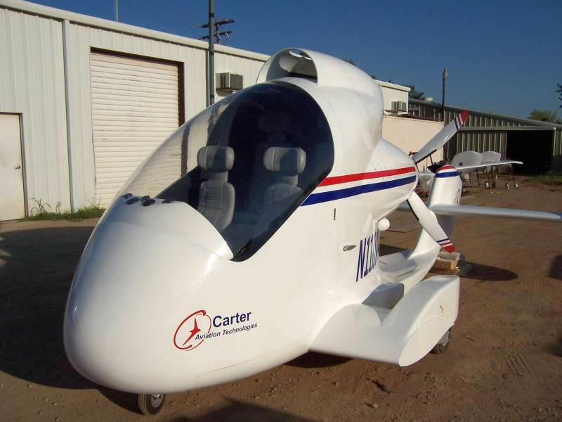 July 29, 2009, Oshkosh, Wisconsin, Carter Aviation Technologies of Wichita Falls, TX has on display at the EAA AirVenture a four place second generation aircraft that is getting plenty of attention from the crowds that have gathered for the air show. Company officials report the four place prototype takes of and lands vertically, can reach speeds of 140 miles per hour and has a rang of 600 miles at 7,500 feet. Their new Personal Air Vehicle (PAV) Prototype. The new PAV prototype is the second-generation aircraft to demonstrate Carter's revolutionary, Slowed Rotor/Compound (SR/C) Aircraft technology. Carter's original prototype, the CCTD, flew for seven years during which time it was the test platform for developing their revolutionary technology - a combination of rotorcraft and fixed-wing aerodynamics. The PAV has some significant changes when compared to Carter's original prototype. |