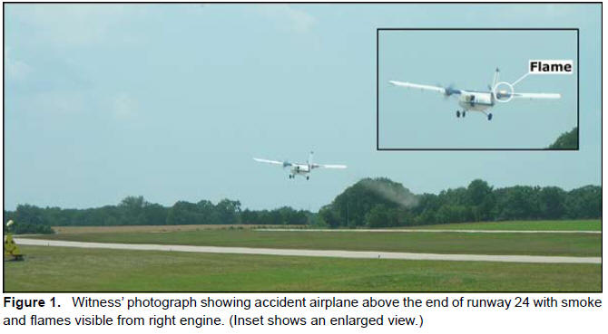Photographic evidence depicting the airport windsock shows that the airplane departed into a moderate headwind. Witnesses at the airport reported seeing the airplane take off and climb to about treetop height.2 Several witnesses reported hearing a “poof” or “bang” noise and seeing flames and smoke coming from the right engine. One witness reported that, after the noise and the emergence of flames, the right propeller was “just barely turning.”