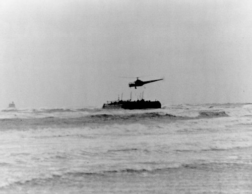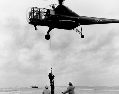 On November 29, 1945, a Sikorsky R-5 hovers over a grounded oil barge in Long Island Sound off Fairfield, CT, to perform the first helicopter hoist rescues in aviation history. The rescue site was a short flight from the Sikorsky factory in Connecticut. Joseph Pawlik, captain of the barge aground on Penfield Reef, off Fairfield, CT, is lowered to safety from a Sikorsky R-5 helicopter piloted by Jimmy Viner, the company chief pilot, assisted by Capt. Jack Beighle of the Army Air Force. The Nov. 29, 1945 hoist rescue was the precursor to many thousands of missions to come. |
