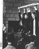On October 4, 1957, when the former Soviet Union successfully launched Sputnik I. The world's first artificial satellite Dr. William H. Pickering, Dr. James A. Van Allen and Dr. Wernher von Braun (left to right) hoist a model of Explorer I and the final stage after the launching. Explorer I, the first U.S. earth satellite was launched by a Jupiter-C with U.S. earth - IGY scientific experiments of Dr. James A. Van Allen.