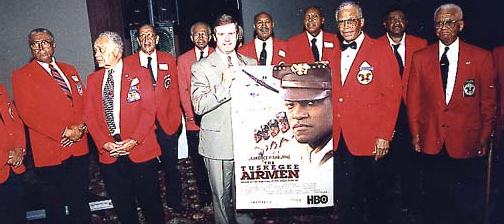 HBO regional director Dave Fiedler (center left) and the late Broadus Butler, former president of the East Coast Chapter of the Tuskegee Airmen, display a poster of the HBO movie “The Tuskegee Airmen,” at the Bolling Air Force Base Officers’ Club in Washington. The movie stars Laurence Fishburne, Andre Braugher and Cuba Gooding Jr. Rudi Williams.
