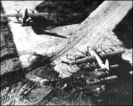 May 17, 1943 AAF B-26 medium bombers in England became operational in the spring of 1943. Not having the long range of the B-17 and B-24, B-26s were used almost exclusively for missions to Holland, Belgium, and northwestern France where they bombed airfields, transportation, and lines of communication. Originally it was planned for B-26s to operate at minimum altitude but a mission against targets in Holland on May 17, resulted in a change of tactics. Eleven planes took off on the mission, one of which turned back. The remaining ten continued to their target and were shot down - not one returned to base. From that time, B-26s bombed from medium altitudes of 10,000' to 15,000' where they suffered relatively light losses from antiaircraft fire compared to heavy bombers. With German fighter forces concentrating on the heavy bombers, AAF medium bombers seldom met appreciable aerial opposition. A B-26 dropping bombs on a German installation in France. The Museum's B-26 painted to represent the same aircraft in the above photo. Maj. Gen. Francis S. Brady, Commanding Officer of the B-26 unit which lost all ten planes on the May 17, 1943 mission, "Explaining" to Maj. Gen. Ira C. Eaker why none returned to England. They are looking at the same model of the target as the crews in the next photo. Lt. Col Stillman briefing the combat crews for an earlier B-26 mission flown May 14, 1943. They are studying a model of the target, the power plant at Ijmuiden, Holland. |