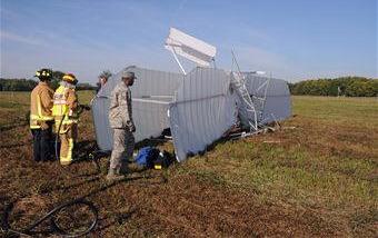 Air Force crash rescue and safety personnel inspect the wreckage of a replica 1905 Wright Flyer III that crashed Oct. 1, 2009 on Huffman Prairie Flying Field at Wright-Patterson Air Force Base, Ohio. Pilot and vintage aircraft builder Mark Dusenberry of Dennison, Ohio, was injured during the practice flight in preparation to celebrate the 104th Anniversary of Practical Flight.