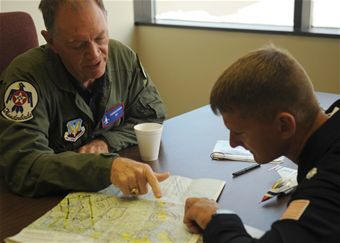 | Nellis Air Force Base, Nev. Federal Aviation Administration Administrator Randy Babbitt (left) receives a preflight briefing from Thunderbirds No. 7 pilot Lt. Col. Derek Routt before his familiarization flight, April 15. The Federal Aviation Administration is responsible for the safety of more than 30,000 aircraft. | ||||
