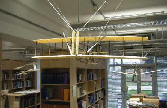 April 7, 2010 - The National Aerospace Library has just taken delivery of a model of the Wright Flyer, the model aircraft is prominently displayed in the Library for all visitors to see. The 1/20th scale model was built in 2003 by David Baxter CEng, FRAeS - as part of the centenary celebrations of the Wright Brothers historic flight – and is based on the original aircraft on display at the National Air and Space Museum in Washington DC. The model is an accurate depiction of the aircraft with which Orville Wright made the first manned powered flight in 1903. The detail on the model is so defined it includes 76 hand cut wing ribs and cotton thread on the trailing edge of the wings to simulate the wire cable used by the Wright Brothers. |
