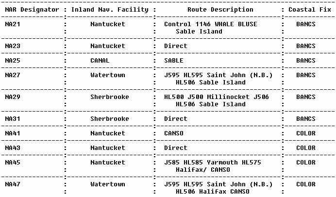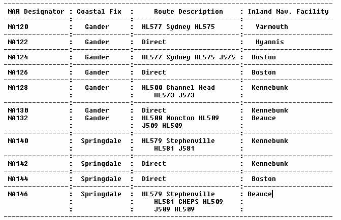 It is expected that current North Atlantic route (NAR) documentation will be carried on the flightdeck of each aircraft operating within the NAR system, including a description of the current NAR and the information contained in the current NAT/OTS message. The official NAR route descriptions are contained in both Canadian Ministry of Transportation (MOT) and U.S. FAA publications. The official FAA listing appears in the MM, issued annually and amended quarterly. Changes to the NAR routes are advertised in the biweekly publication "International Notices to Airmen." The following list divides the NAR route description into two sections according to the direction of the flight. Each section is subdivided according to route portion (common or noncommon). The common portion describes the NAR route between the costal fix and the inland navigational facility. The noncommon portion describes the route between the NAR route system airport being used and the inland navigational facility.